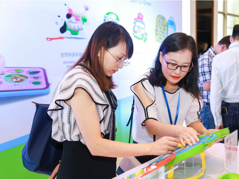 伟易达KidiSchool新品发布会现场,参会嘉宾正在体验KidiSchool新品——字母拼写书包