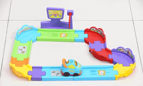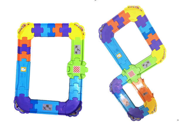 不过2岁以下宝宝独自玩的话,还做不到有序拼接,建议由浅入深,先用简单的轨道片拼接简易赛道进行游戏,如下图。