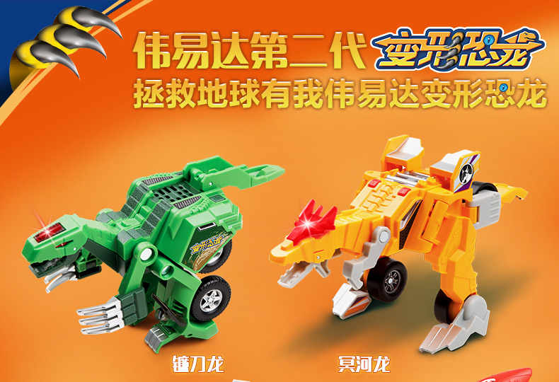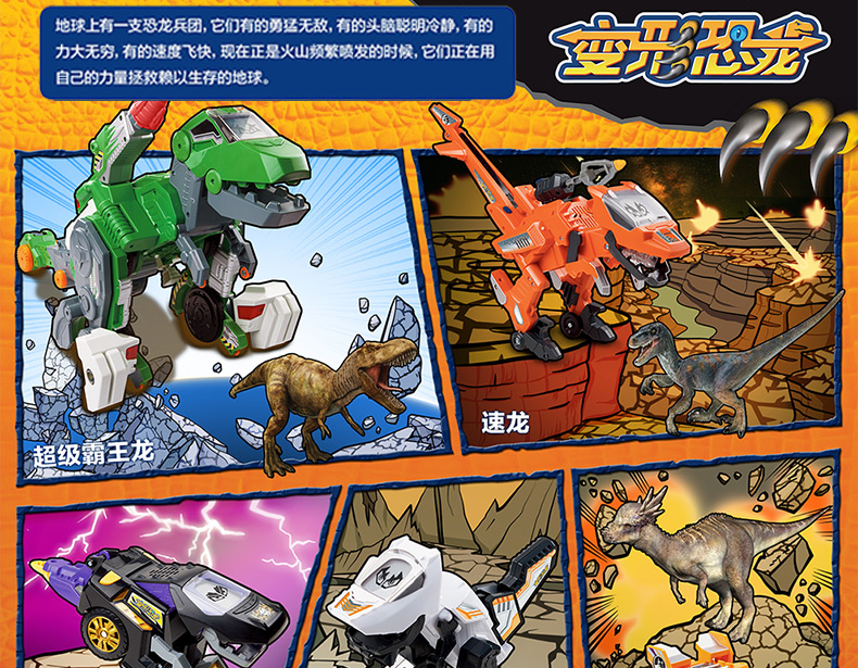 风靡全球的“变形”主题,为3岁以上孩子精心打造。能变形,会说话,能唱歌。每条恐龙都被赋予了各自的个性和能量,可变身各式威力战具,满足孩子强烈的好奇心,加强动作能力。多条恐龙在一起就是恐龙战队,发挥想象,培养团队合作精神,让孩子“玩转”侏罗纪。