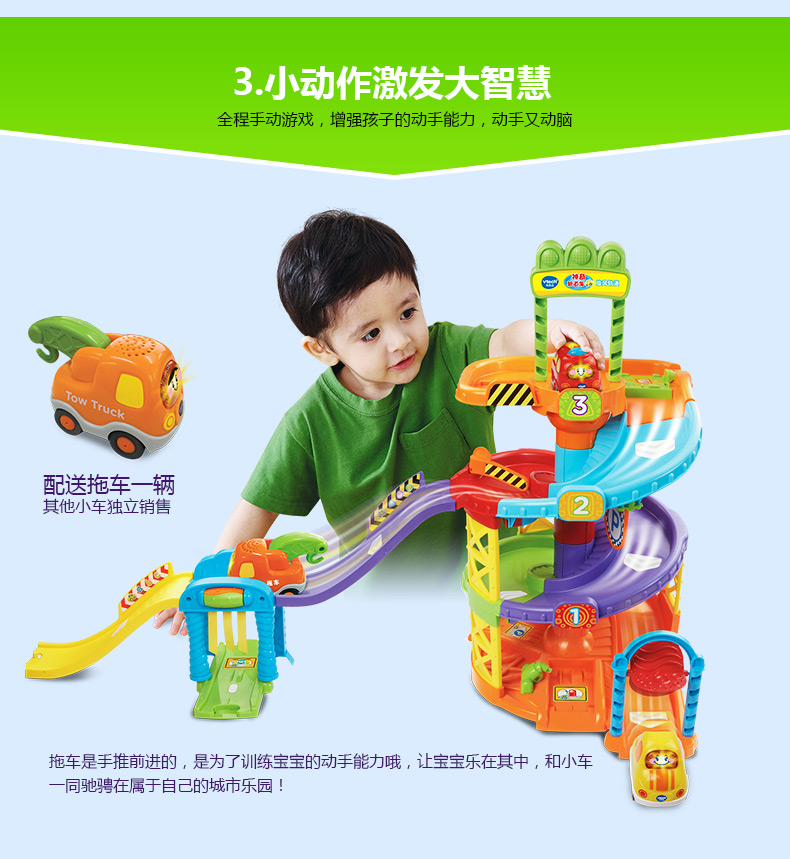 伟易达“神奇轨道车 旋风轨道”充满着无限的学习乐趣!推动 “汽车小镇”的任意一辆神奇轨道车经过旋风轨道的神奇感应区时,都能识别旋风轨道包含加油点,洗车点和停车点在内的6个神奇感应区并 给出相应的情景反应。