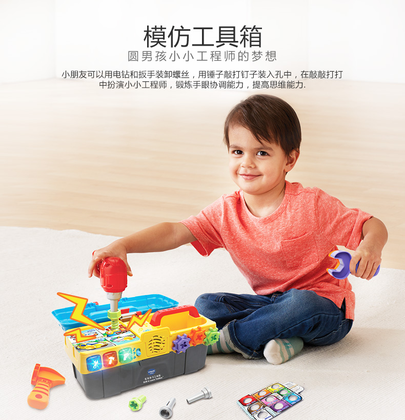 打开伟易达“互动学习工具箱”体验角色扮演的乐趣!鼓励小朋友使用配赠的钻 枪、扳手、铁锤、螺丝、钉子来完成工程任务卡上的修理任务;在游戏的同时学习工 具、颜色及物体。寓教于乐,提高小朋友的语言及动手能力!