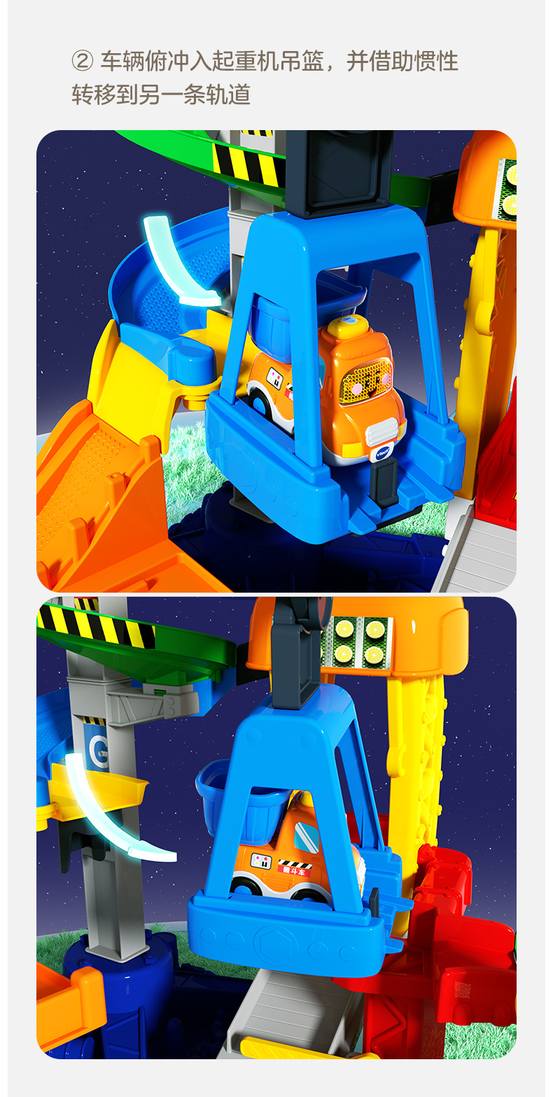 将翻斗车放到制高点,抬起顶部发射器,小翻斗车开始奇妙高空滑行之旅咯~从高到低,从左到右,五层立体螺旋轨道完美接驳趣味吊塔,好似空中飞车一般,彰显过人特技,so cool !